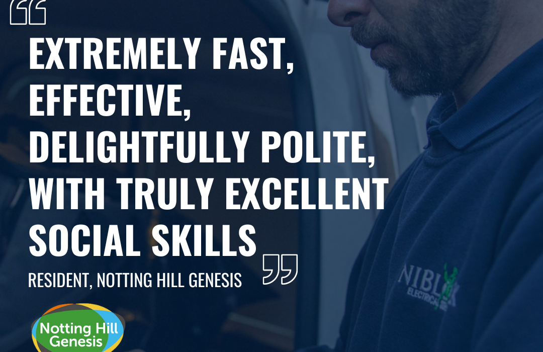 We were delighted to receive a message of appreciation from a Notting Hill Genesis Housing Assocation Resident regarding one of our electricians, Tyrell, and a second-year Niblock Electrical apprentice, Alex, whom recently attended the property to conduct electrical safety checks.